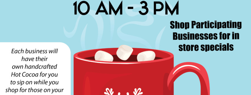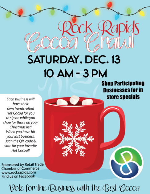 Cocoa CrawlDecember 8, 2025/in Front Page, News/by Rock Rapids ChamberMake plans to attend the Cocoa Crawl Saturday, Dec. 13 from 10 am-3 pm. Participating businesses include: All Things Renewed County Seat Grill Details Liquor Locker Luxe on First Primrose Market Rosie’s Sit a Minute Sunshine Foods https://rockrapids.com/wp-content/uploads/2025/12/Cocoa-Crawl-2025.jpg 2560 1978 Rock Rapids Chamber https://rockrapids.com/wp-content/uploads/2018/07/rr-id-website-whitescale-680x250.png Rock Rapids Chamber2025-12-08 07:34:052025-12-08 07:36:15Cocoa Crawl