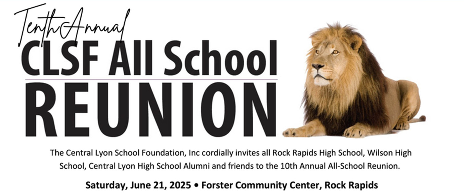 The Central Lyon School Foundation Board invites all the Rock Rapids High School, Wilson High School and Central Lyon Alumni and friends to the 10th Annual All-School Reunion.