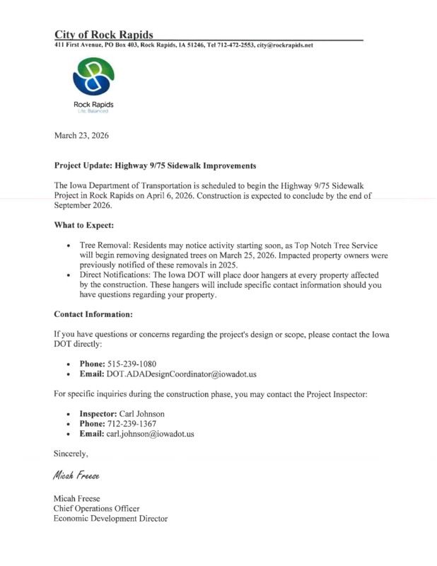 You are here: Home1 / Front Page2 / March 23, 2026 Project Update: Highway 9/75 Sidewalk Improvements