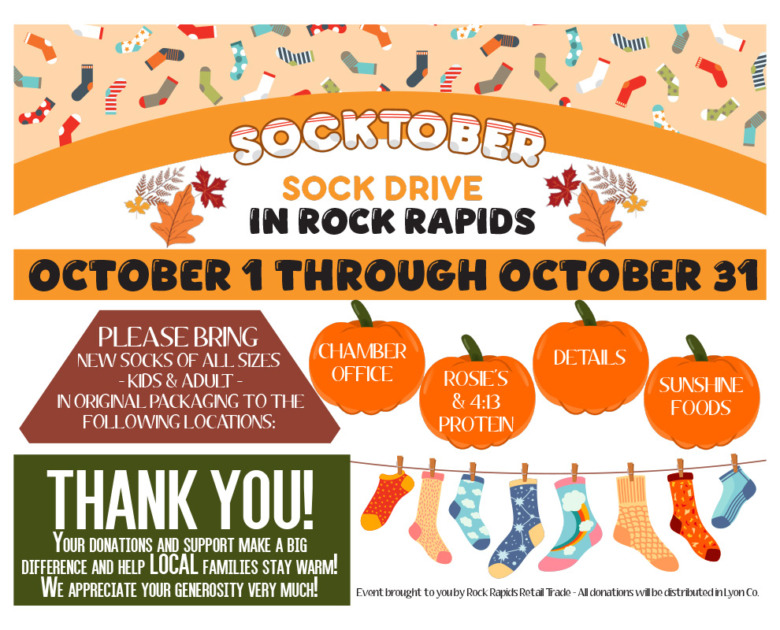 SocktoberOctober 23, 2025/in Front Page, News/by Rock Rapids Chamber Socktober Sock Drive October 1-31 Drop off new socks of all sizes (kid & adult) in original packaging to Chamber office, Sunshine, Details & Rosies. Socks will be distributed in Lyon County. Sponsored by Retail Trade. https://rockrapids.com/wp-content/uploads/2025/10/rr-post-2025-socktober-990x800-1.jpg 800 990 Rock Rapids Chamber https://rockrapids.com/wp-content/uploads/2018/07/rr-id-website-whitescale-680x250.png Rock Rapids Chamber2025-10-23 10:55:062025-10-23 10:55:06Socktober